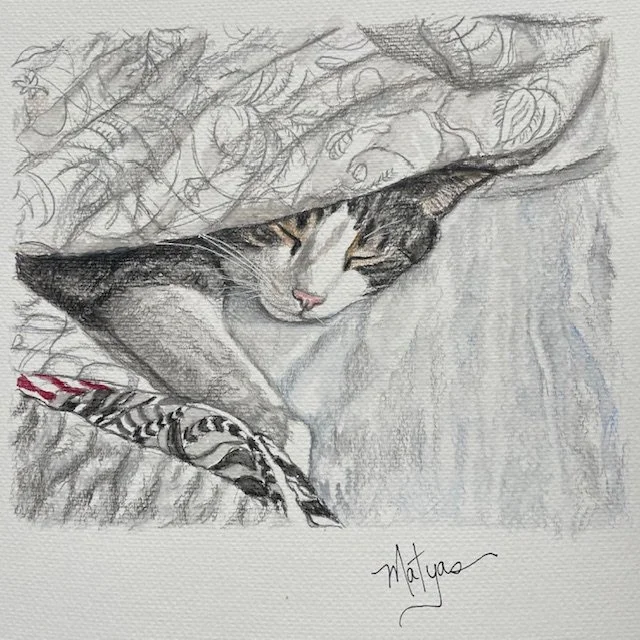 "We first met Ginger at a cat hotel nine years ago and she took such good care of our two cats that she left a lasting impression! We wanted Ginger to cat sit for us but we were out of the service area. We were so happy when Ginger moved last year and we were in her service area! Ginger is the best cat sitter ever! She is our go to and the one we trust the most. Our cat family has grown to six (we recently rescued two kittens) and she is the only one we trust to handle all six and their complex needs and feeding schedule. She gives medicine and gives all of them individual attention. She reats our pets like they are her own and goes above and beyond to make sure they are well taken care of and even have some fun! She always leaves a detailed report on what she's done for the cats and provides some extra goodies for us and them. She makes recommendations for what they need and what would make them happier and healthier. We always learn from her! On top of it all Ginger does cat and dog portraits and has done six for us. She included two cats on a greeting card set and also on a calendar she makes.She also takes very good pictures of them and communicates frequently while we are away. She is a very talented artist and genuinely loves cats. We strongly recommend Ginger!"- KAT HENDRIX